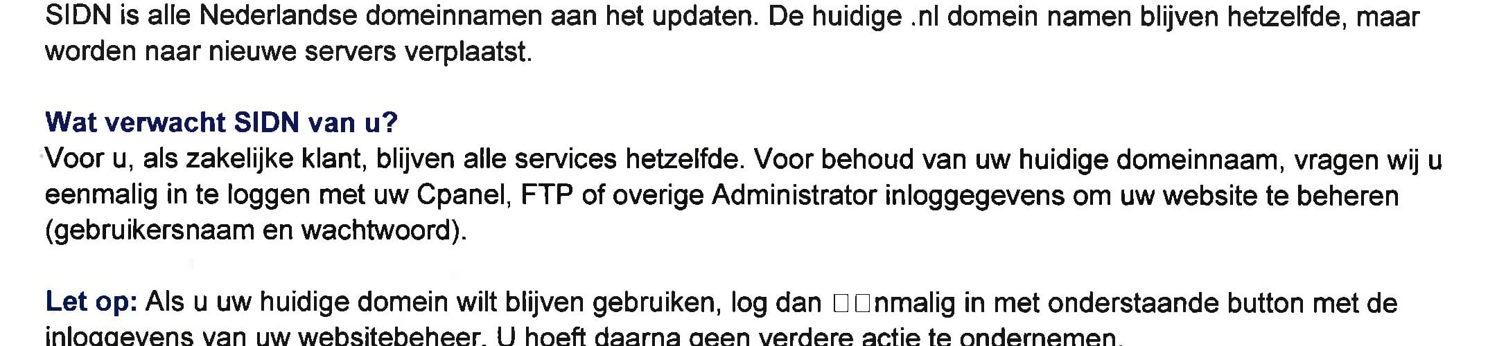 Klanten van SIDN, zowel registrars als domeinnaamhouders, ontvangen momenteel e-mailberichten met als onderwerp ‘Domeinnaam .nl updaten’. Ontvangers van de mail wordt gevraagd om ‘in te loggen met de inloggegevens voor uw websitebeheer’, om hun domeinnaam te kunnen behouden. sts zaklady bukmacherskie